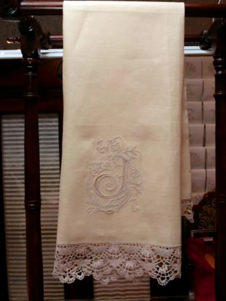 Toalla elaborada de modo artesanal en crepê de lino marfil rematada con encaje de bolillos color beige en los dos extremos.