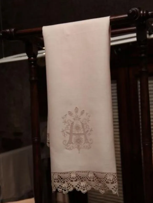Crepê de lino color salmón rematado con encaje de bolillos e inicial bordada.