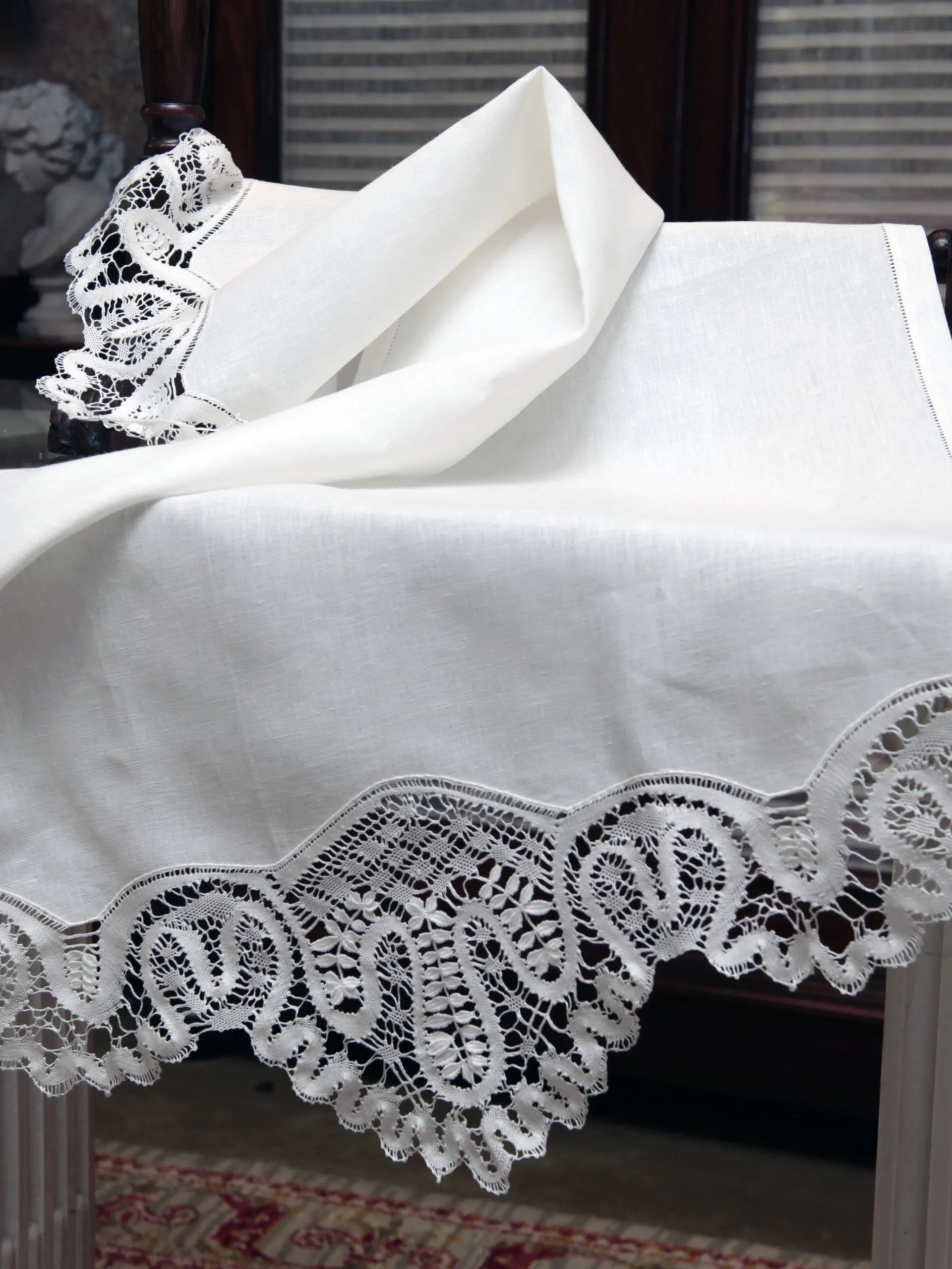 Toalla elaborada artesanalmente en lino 100% natural , cuidadosamente rematada con vainica y encaje de bolillos.
