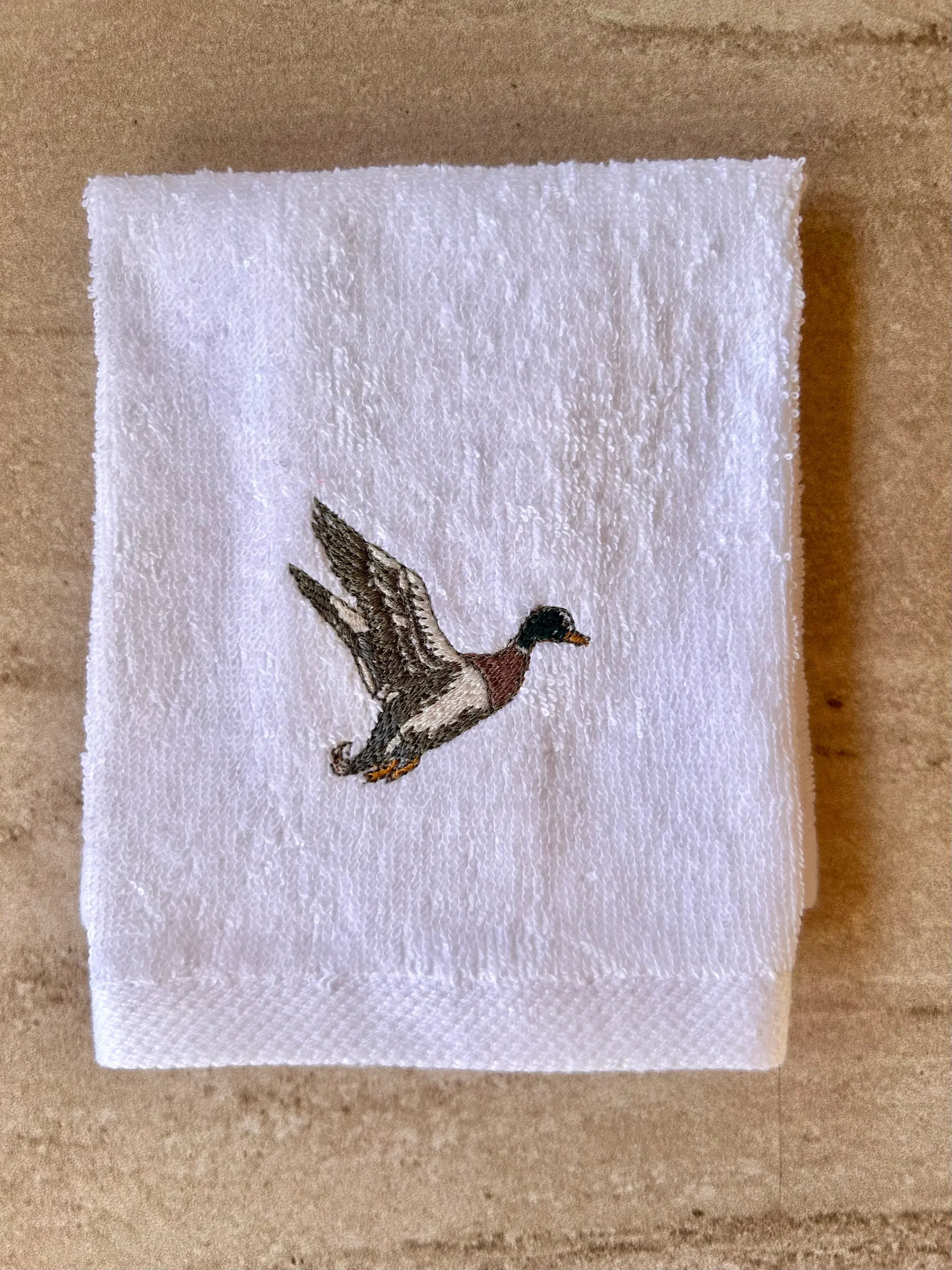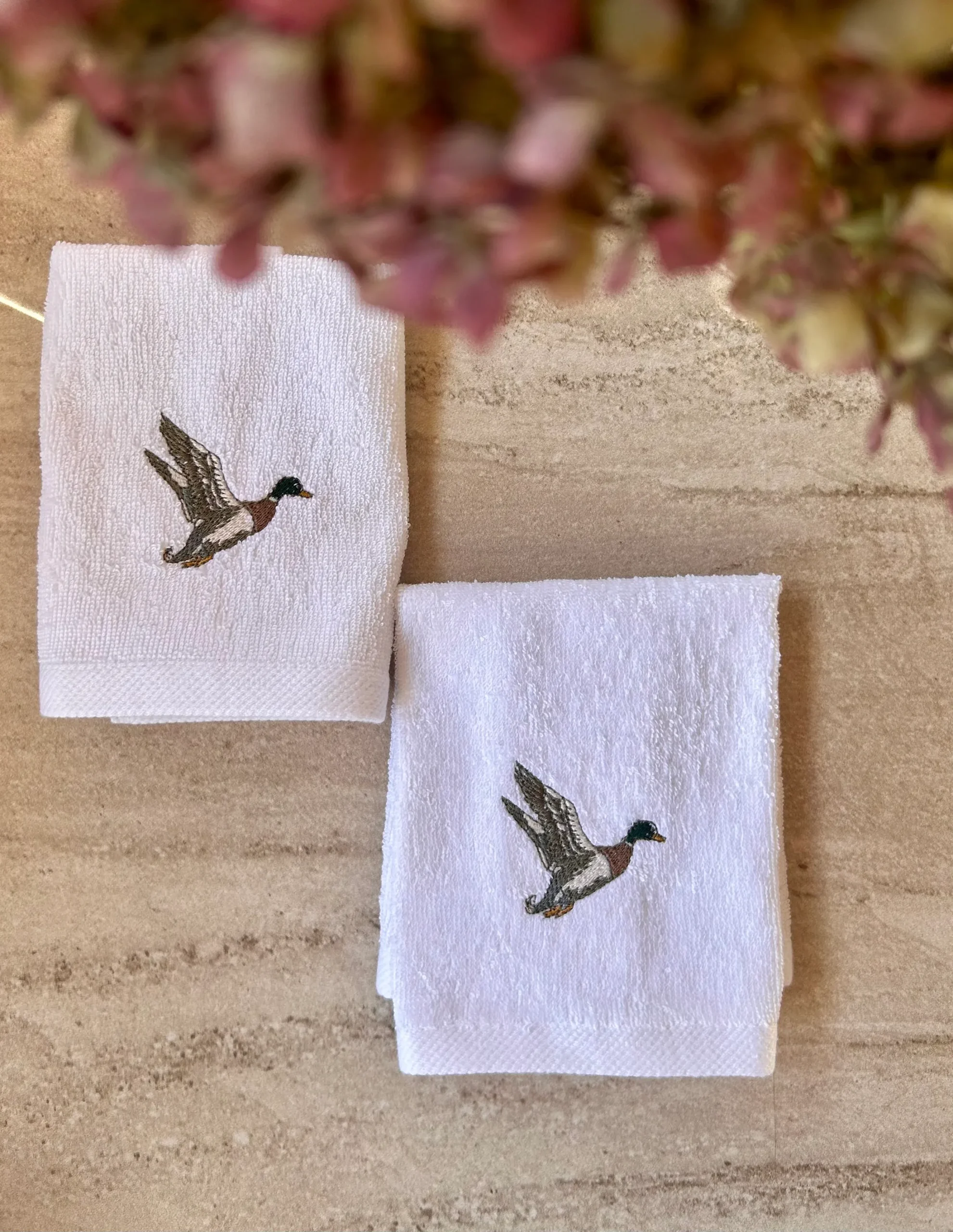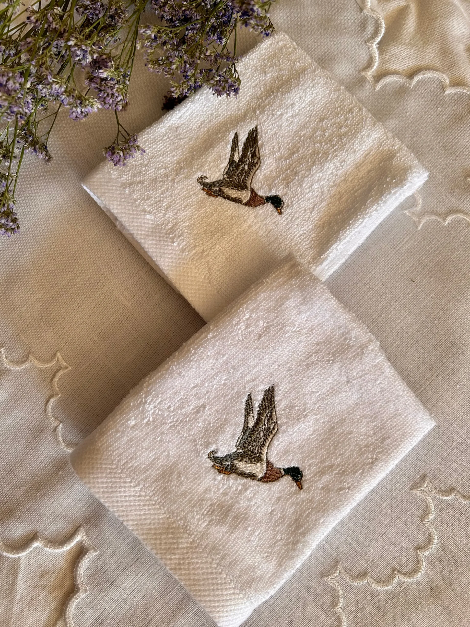 Este pack de 2 toallas de cara tamaño 30x30cm bordadas con unos patos. Ideales para tener en el aseo.