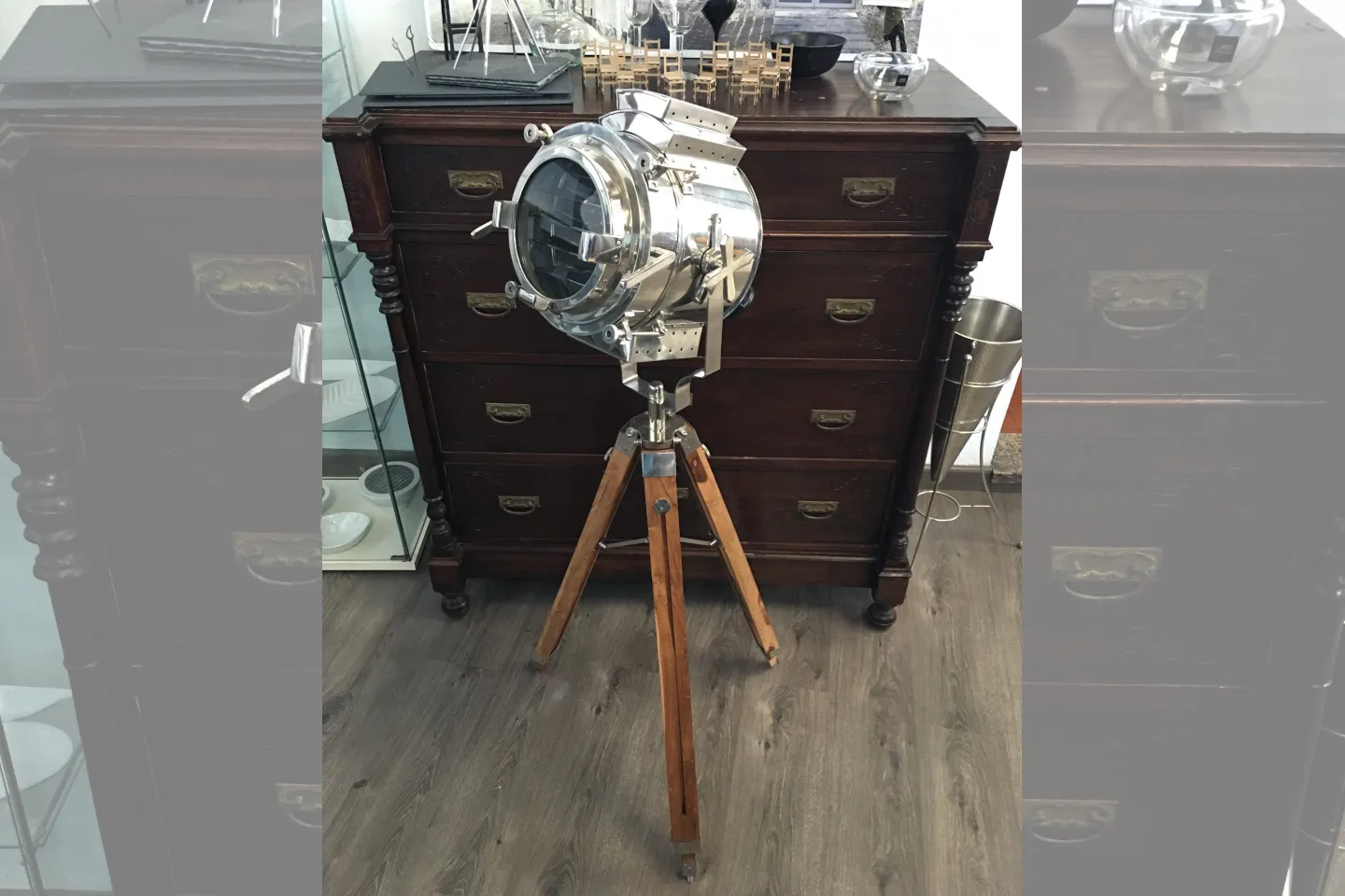 Réplica de Lámpara náutica de señal de búsqueda marina, en un trípode de madera marrón. De estilo Industrial. Esta lámpara está hecha de acero de buena calidad, aluminio cromado brillante y madera de teca en pulido marrón natural.