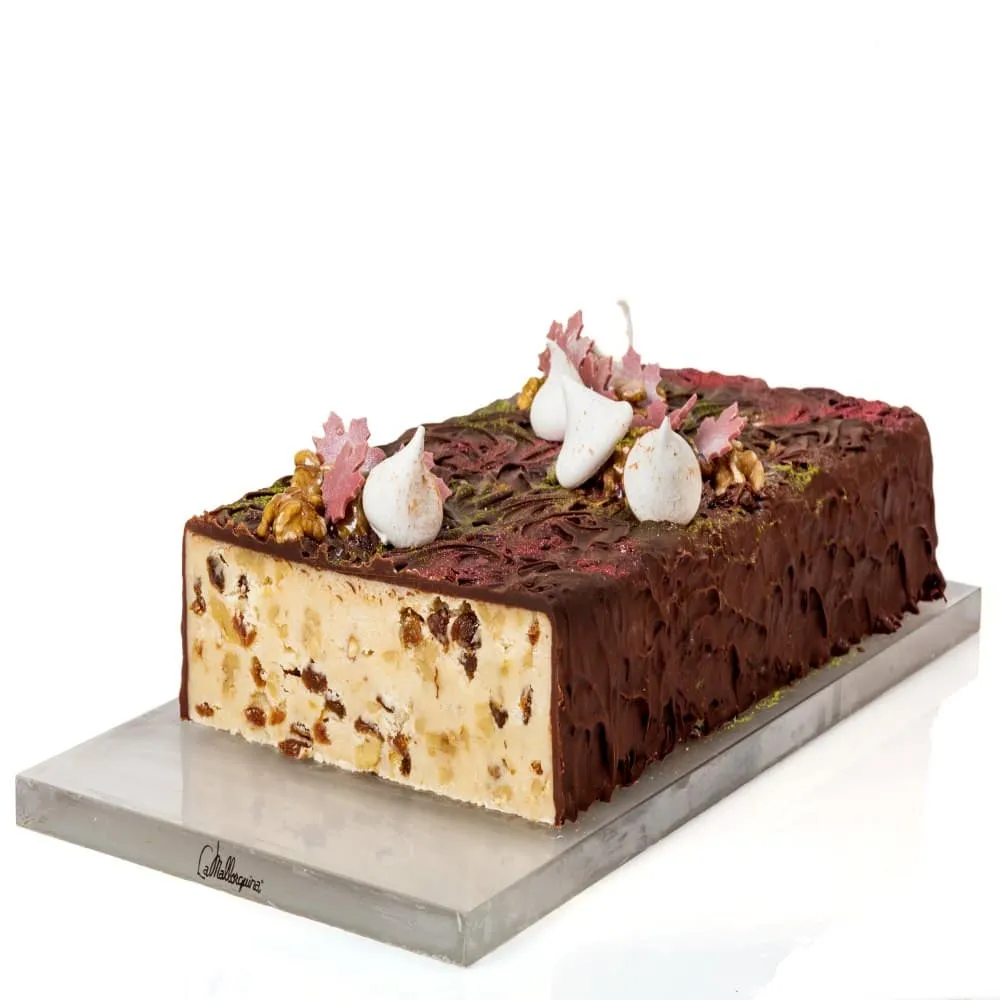 Turrón de elaboración propia. Se trata de un glaseado de chocolate con leche, acompañado de almendras, nueces, pasas… Innovación diaria.