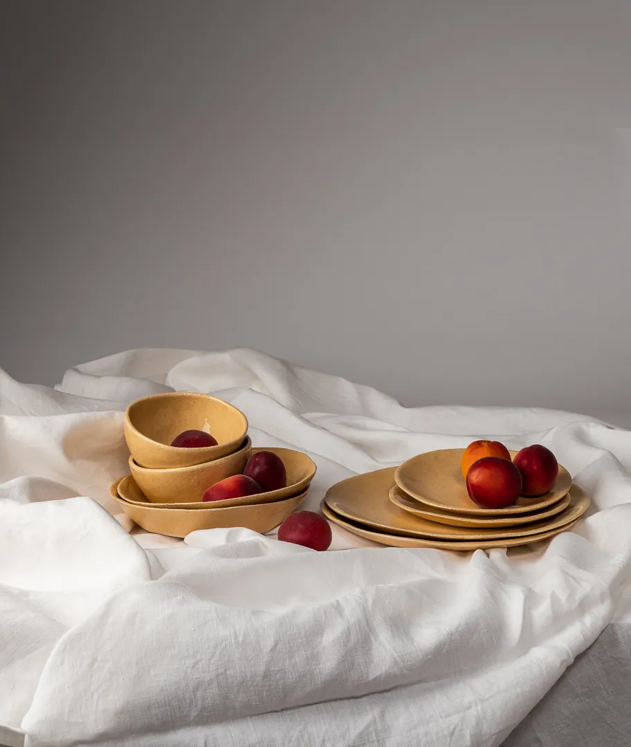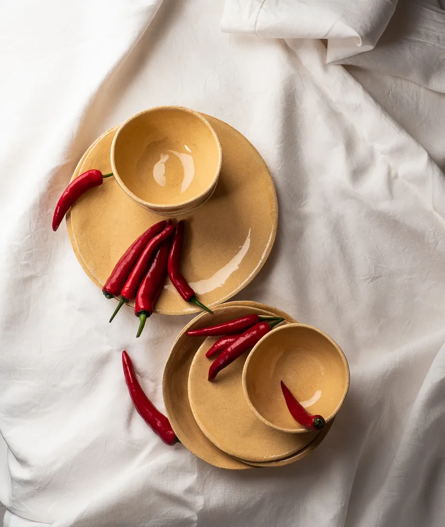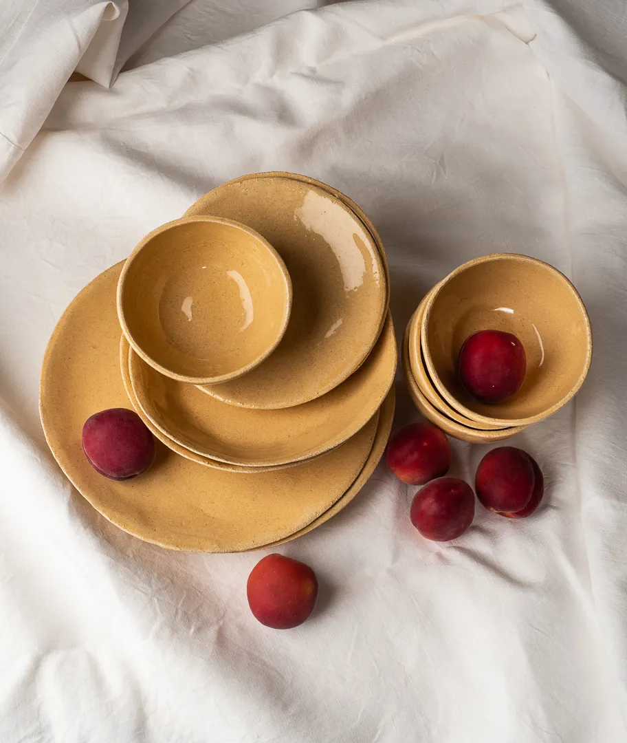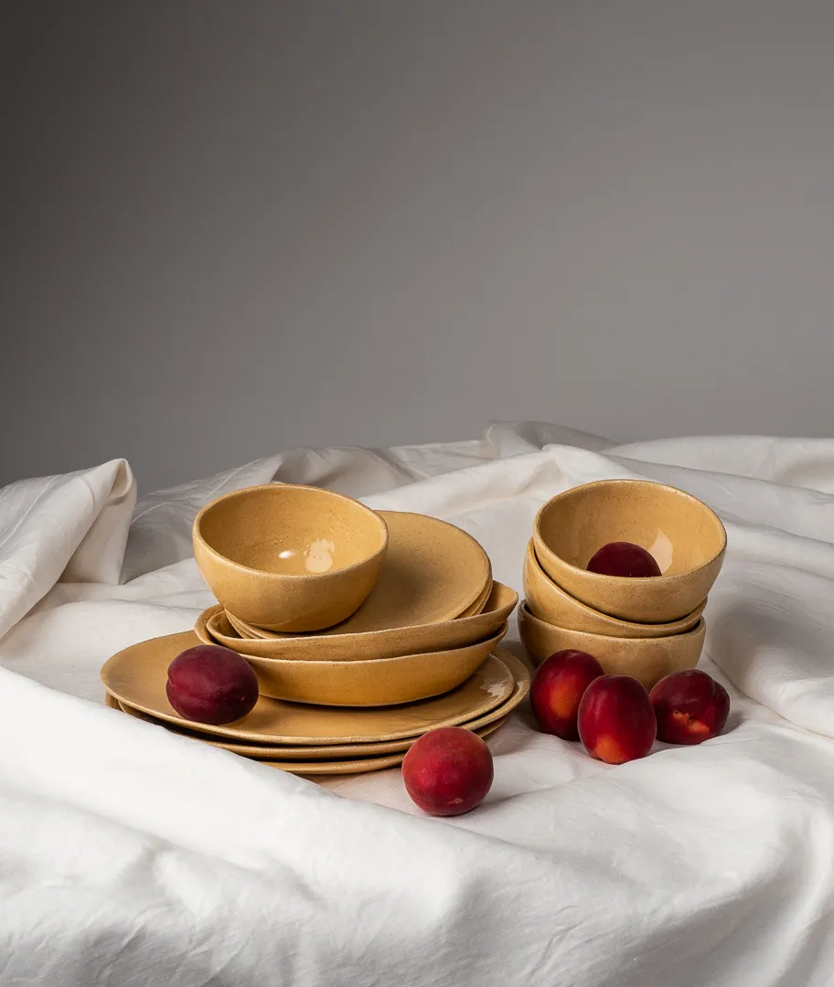 Vajilla para 4 personas realizada en gres en color mostaza (16 piezas).