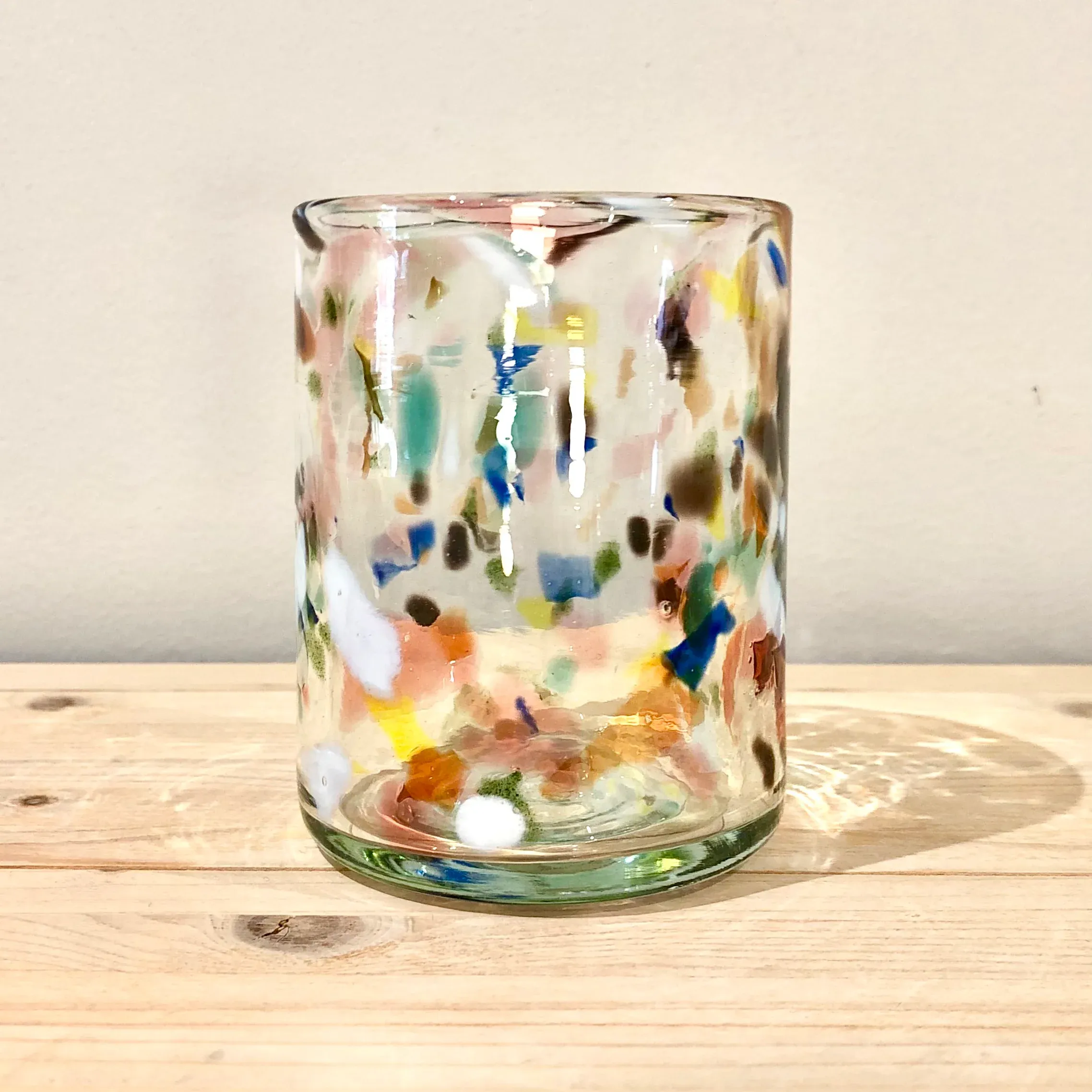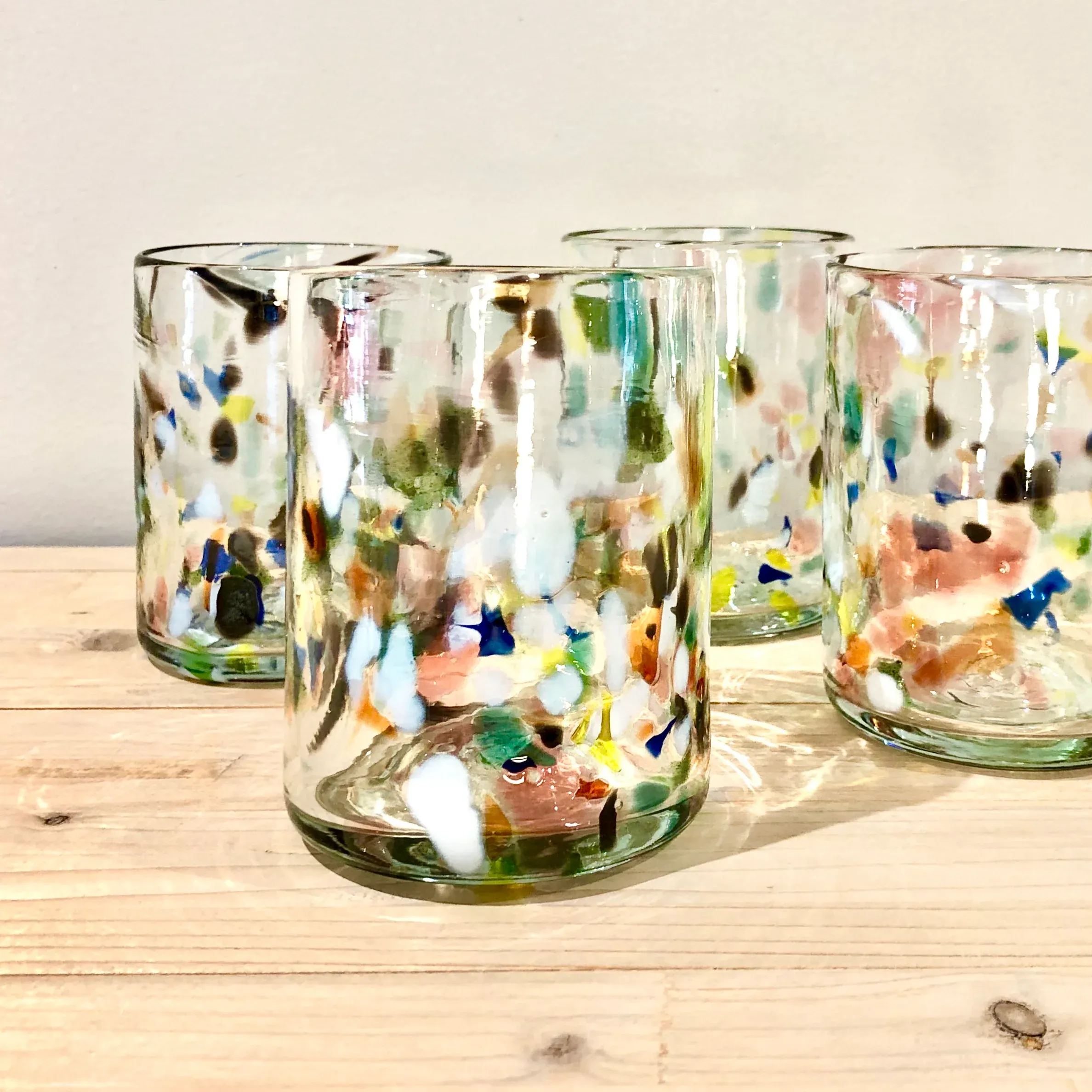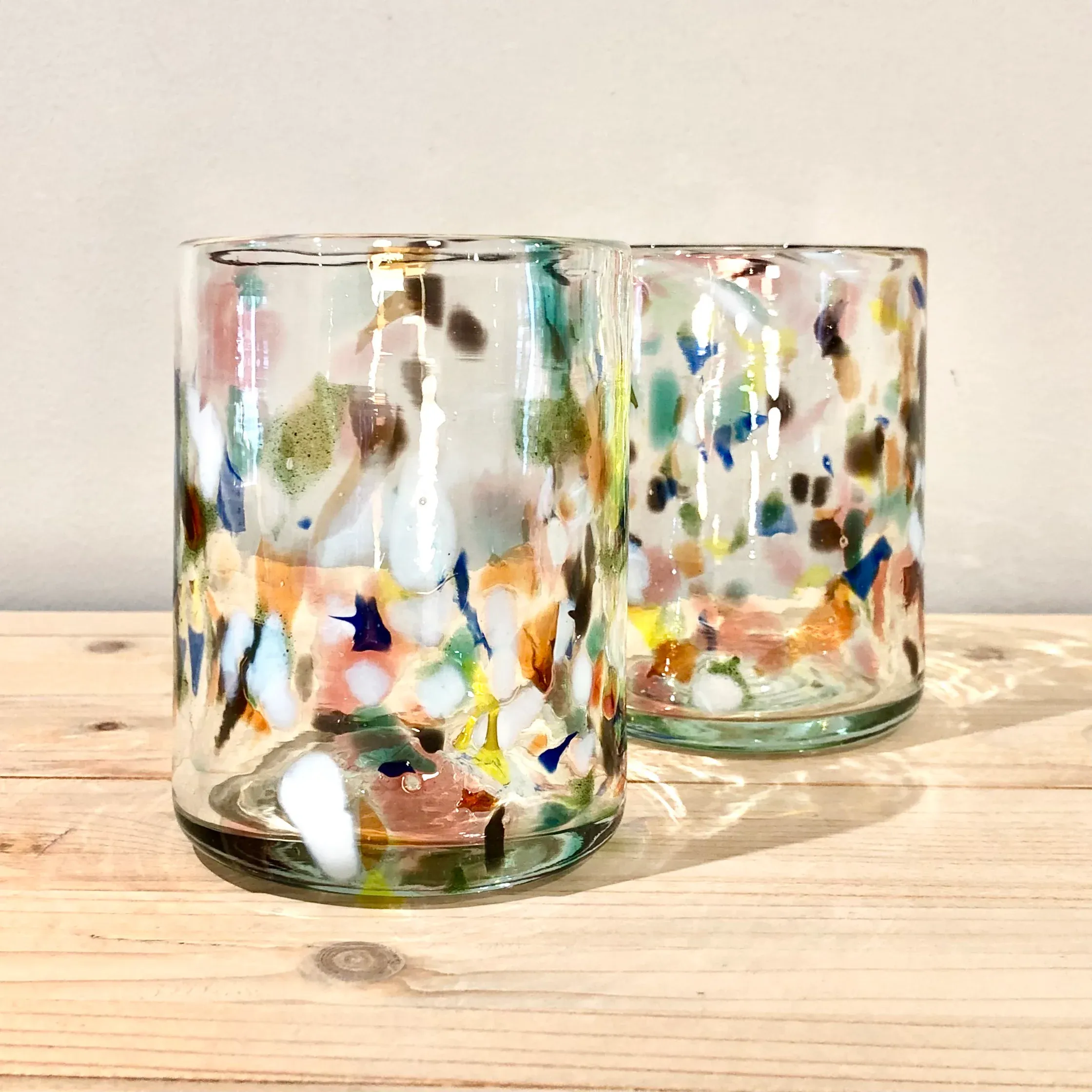 Cada vaso tiene un espectacular dibujo de manchas irregulares en diferentes colores que nunca se repiten de la misma forma.