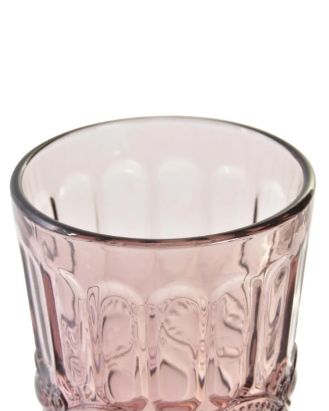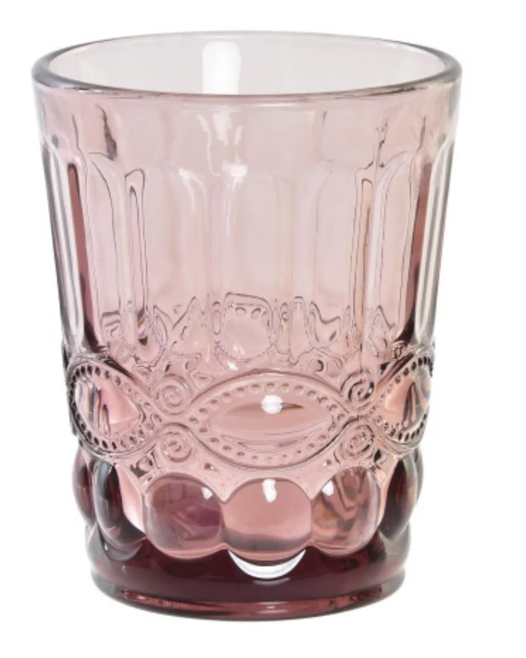 Vaso de cristal con relieve en color rosa. Medidas 8 x 8 x 10 cm. Capacidad 240 ml. Apto para lavavajillas.