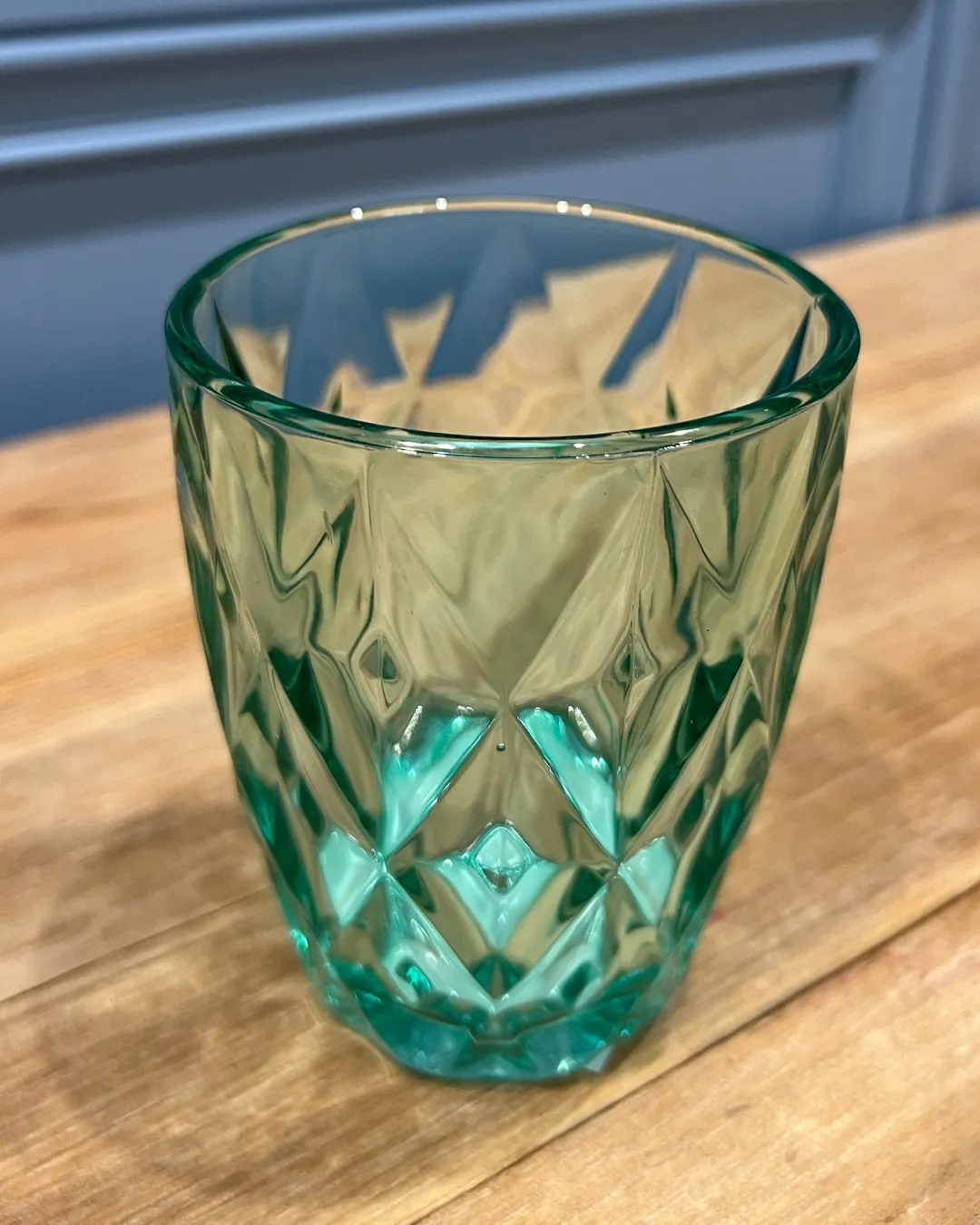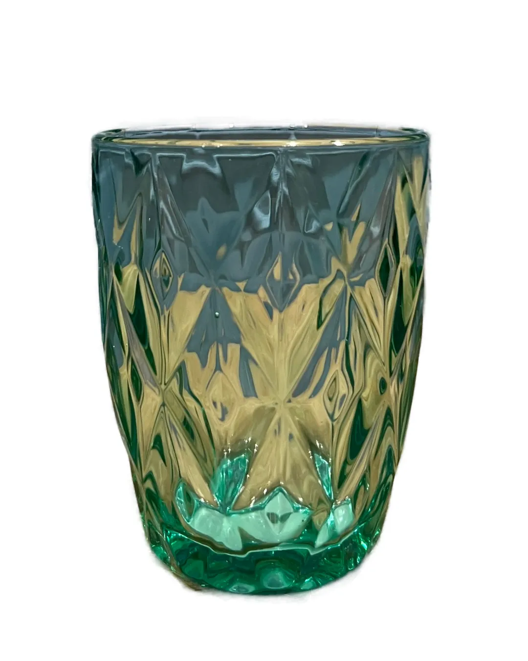 Vaso de cristal con relieve en color turquesa. Medidas 8 x 8 x 10 cm. Capacidad 240 ml. Apto para lavavajillas.