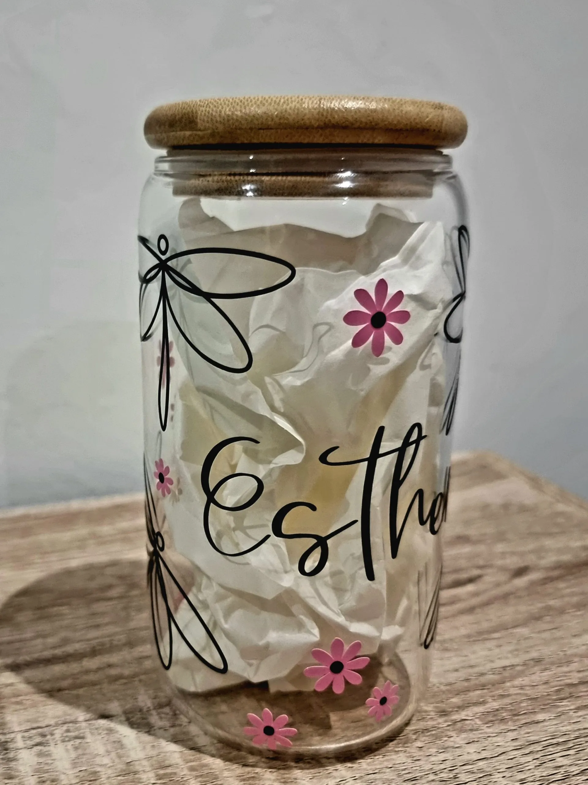 Un vaso muy bonito con libélulas flores y nombre ideal para el café con hielo o para el de las mañanas o meriendas.