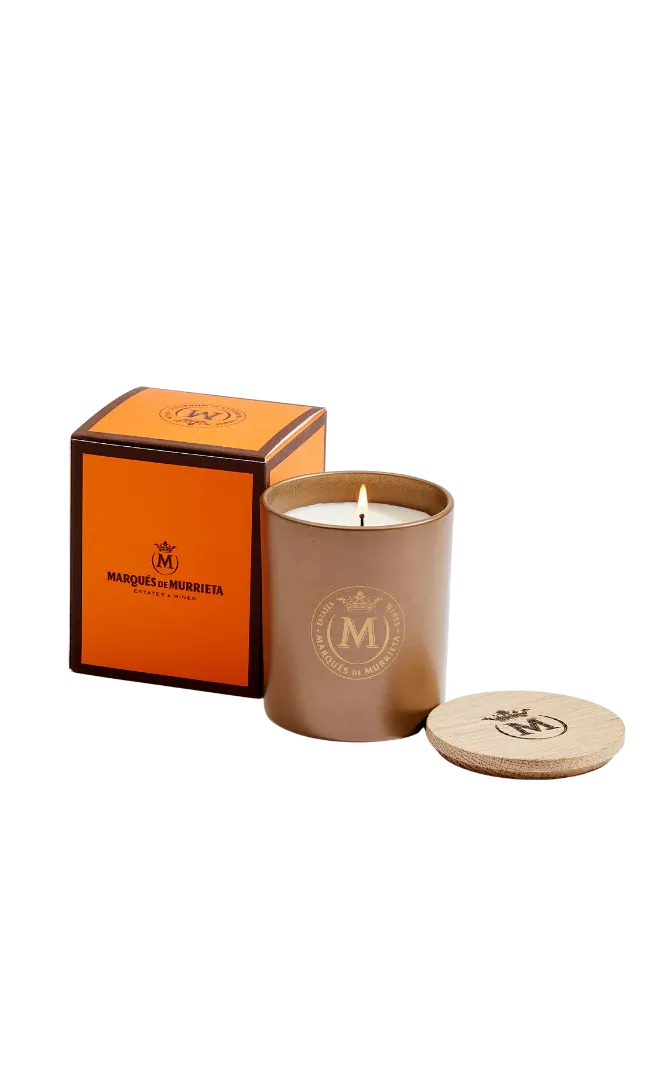 Vela aromática edición limitada con fragancia personalizada para Marqués de Murrieta. Cera 100% natural, de origen vegetal*. Vela de gran calidad, hecha a mano en España. Vela en vaso de cristal personalizado y tapa de madera con logo de Marqués de Murrieta grabado. Hasta 45 horas de duración.