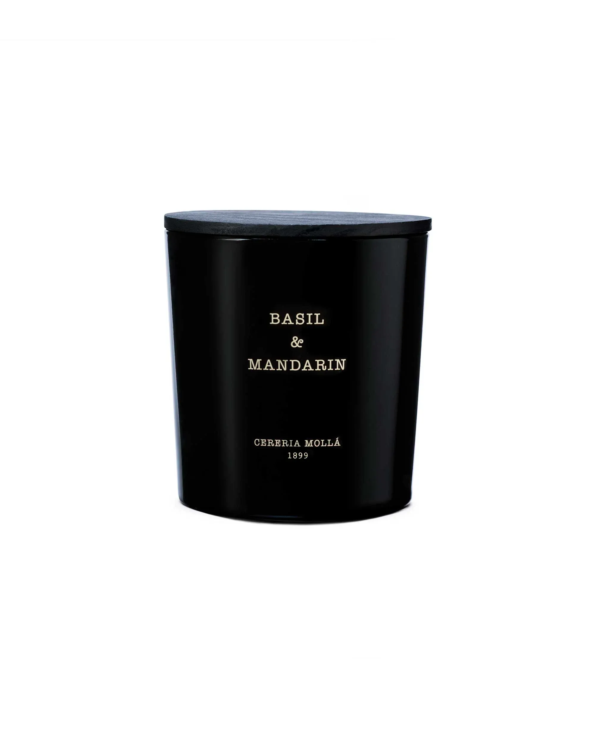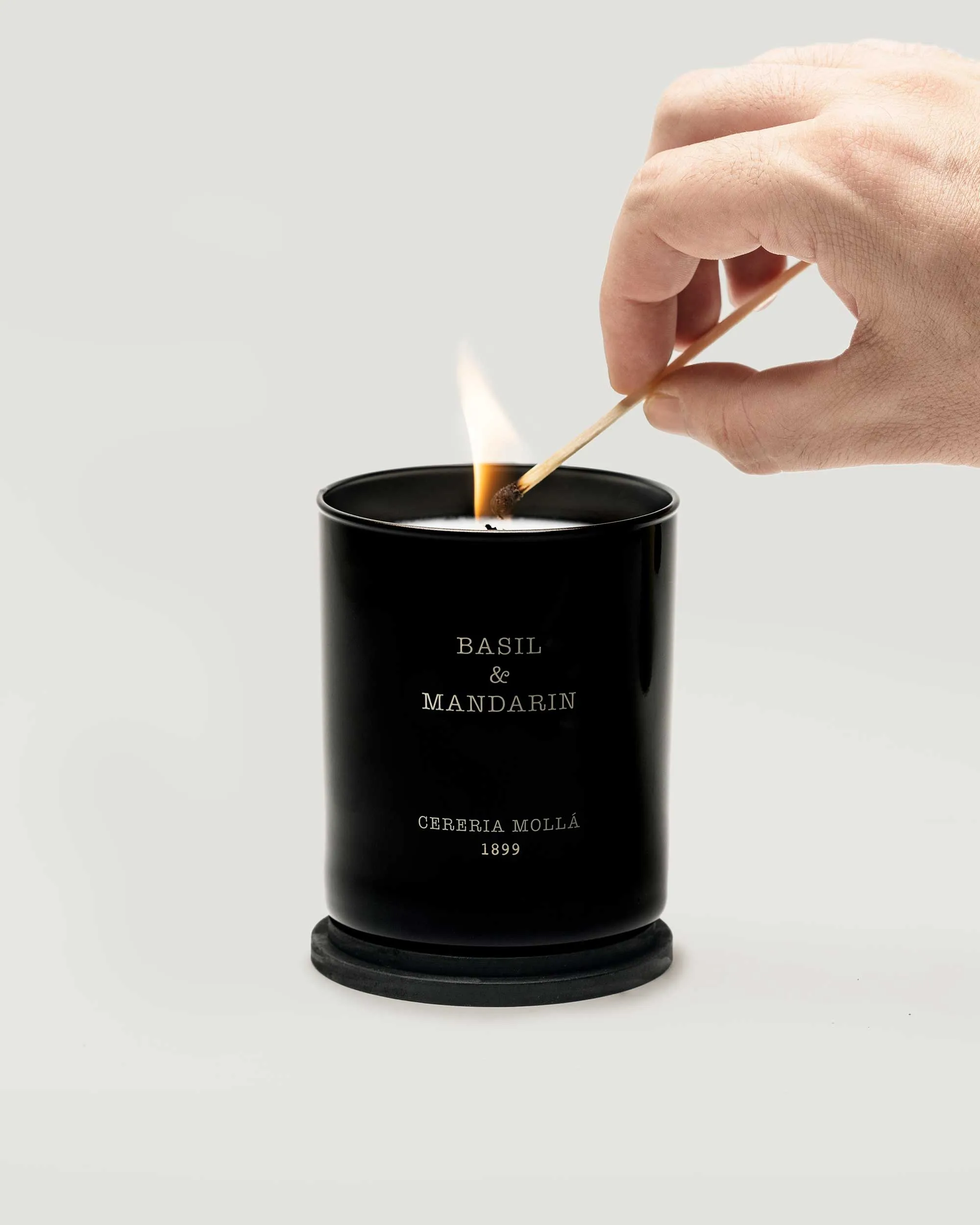 Vela aromática Basil & Mandarin en vaso de vidrio en color negro. Disponible en dos tamaños, mediano de 230 gr. y pequeño de 70 gr.