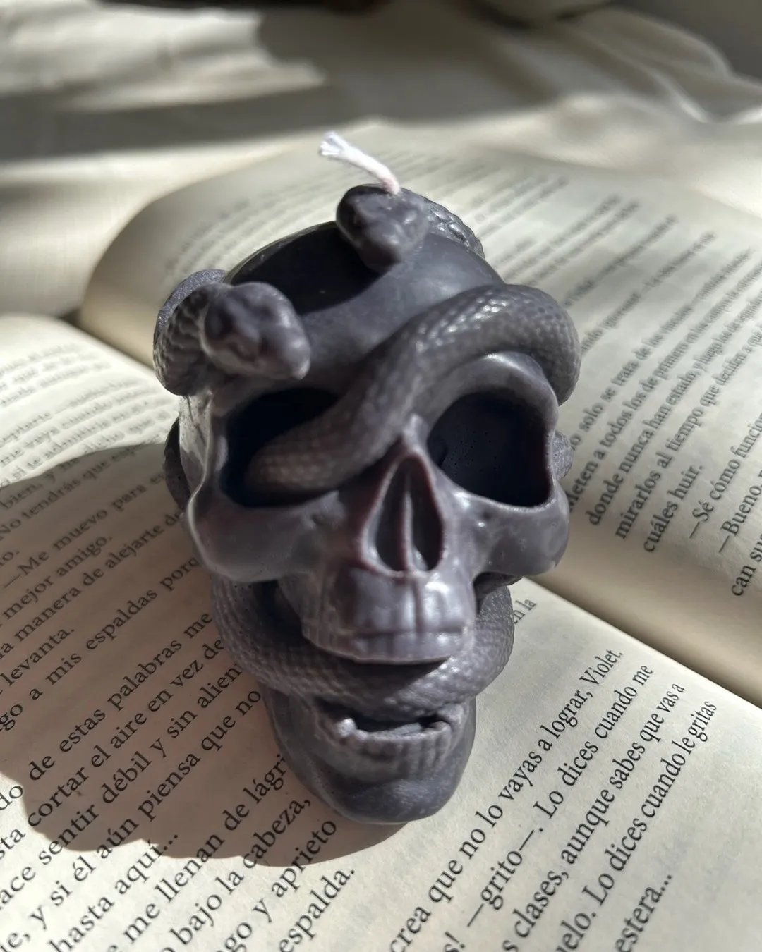 Una vela artesanal que evoca a aquellos seguidores de la magia más oscura. Inspirada en las máscaras que ocultan rostros y revelan lealtades, esta calavera es un guiño a los símbolos más inquietantes del mundo mágico.