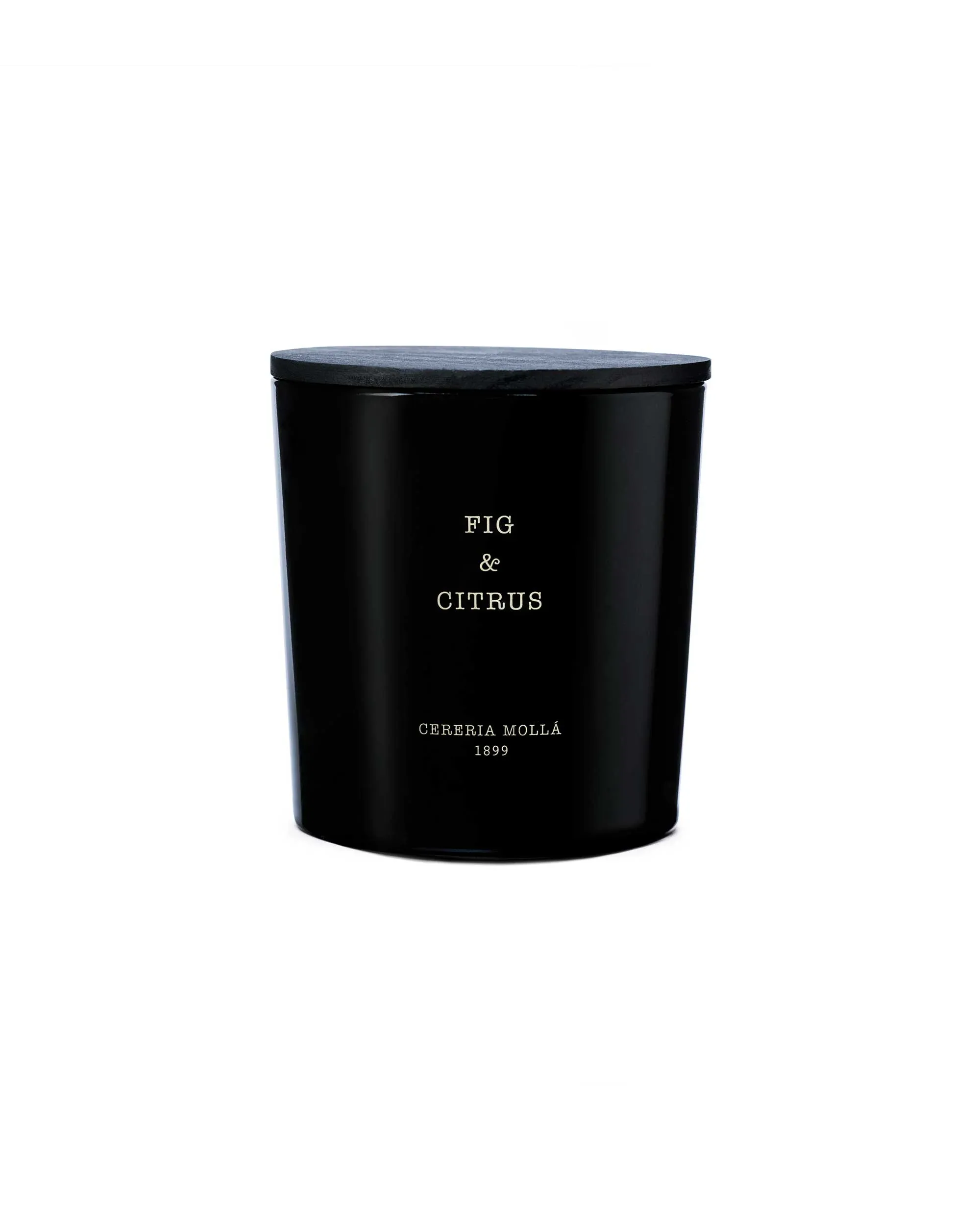 Vela aromática Fig & Citrus en vaso de vidrio en color negro. Disponible en tres tamaños: pequeño de 70 gr., mediano de 230 gr. y XL de 600 gr. Y equipada con tres mechas en su tamaño superior.