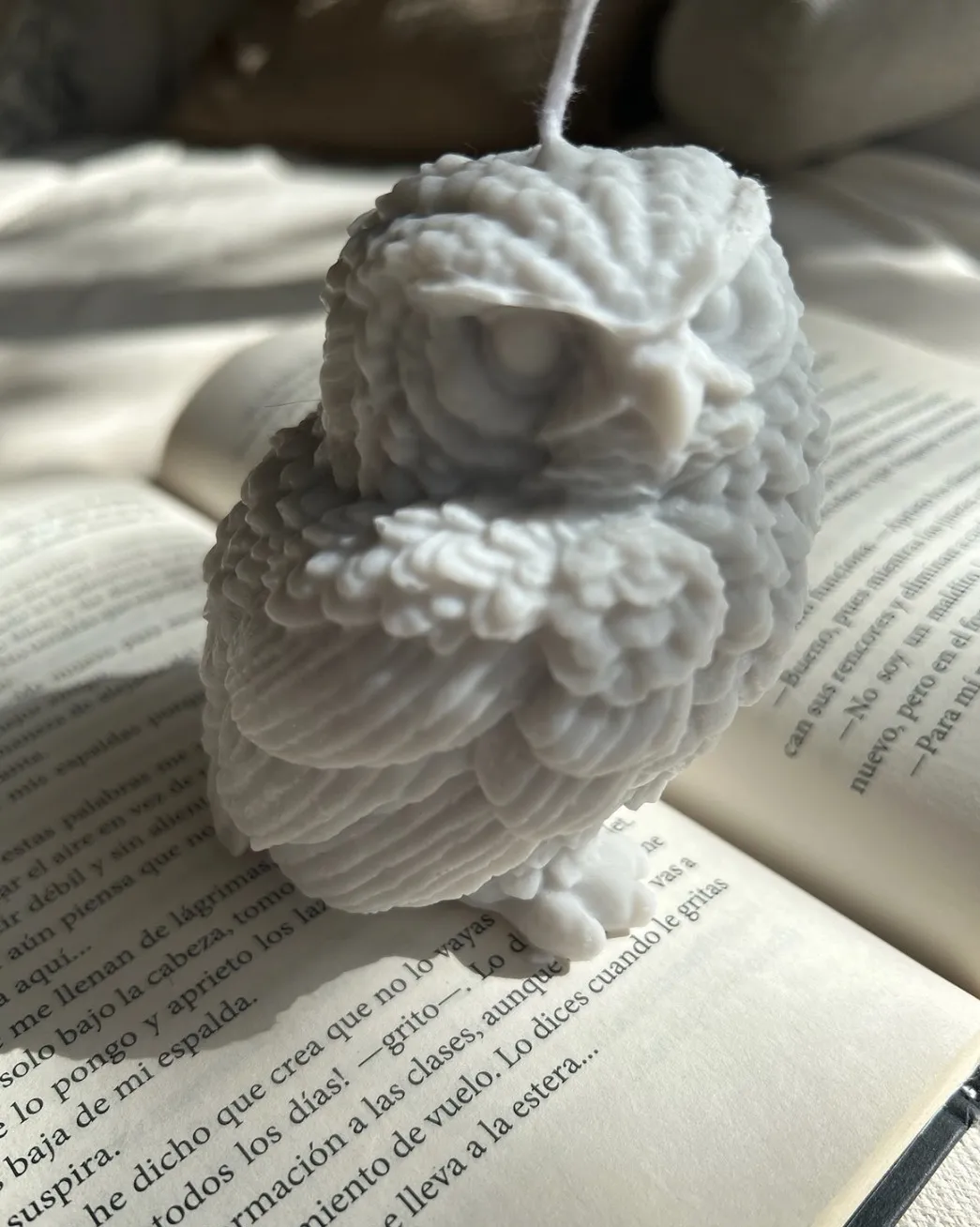 Vela de cera de soja en forma de lechuza blanca, símbolo del mundo mágico. Su silueta detallada y su acabado la convierten en una pieza decorativa ideal para amantes de la fantasía y la estética mágica. Hecha a mano de forma artesanal.