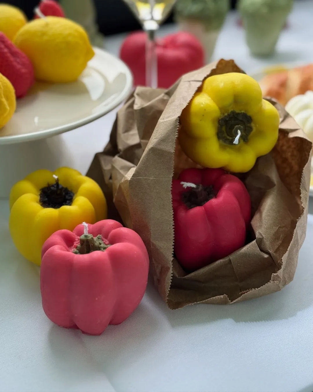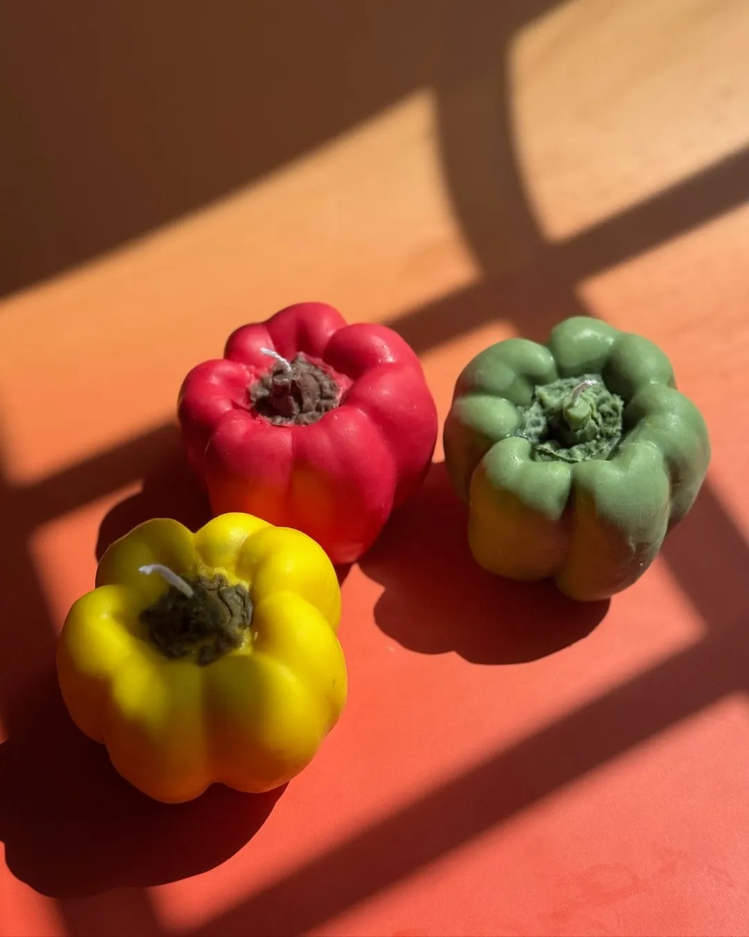 Nuestra vela Pimiento es un guiño a las cocinas llenas de color y vida. Disponible en rojo, amarillo o verde, reproduce con detalle la textura y forma de un pimiento fresco. Una pieza ideal para los que disfrutan de lo cotidiano convertido en arte.