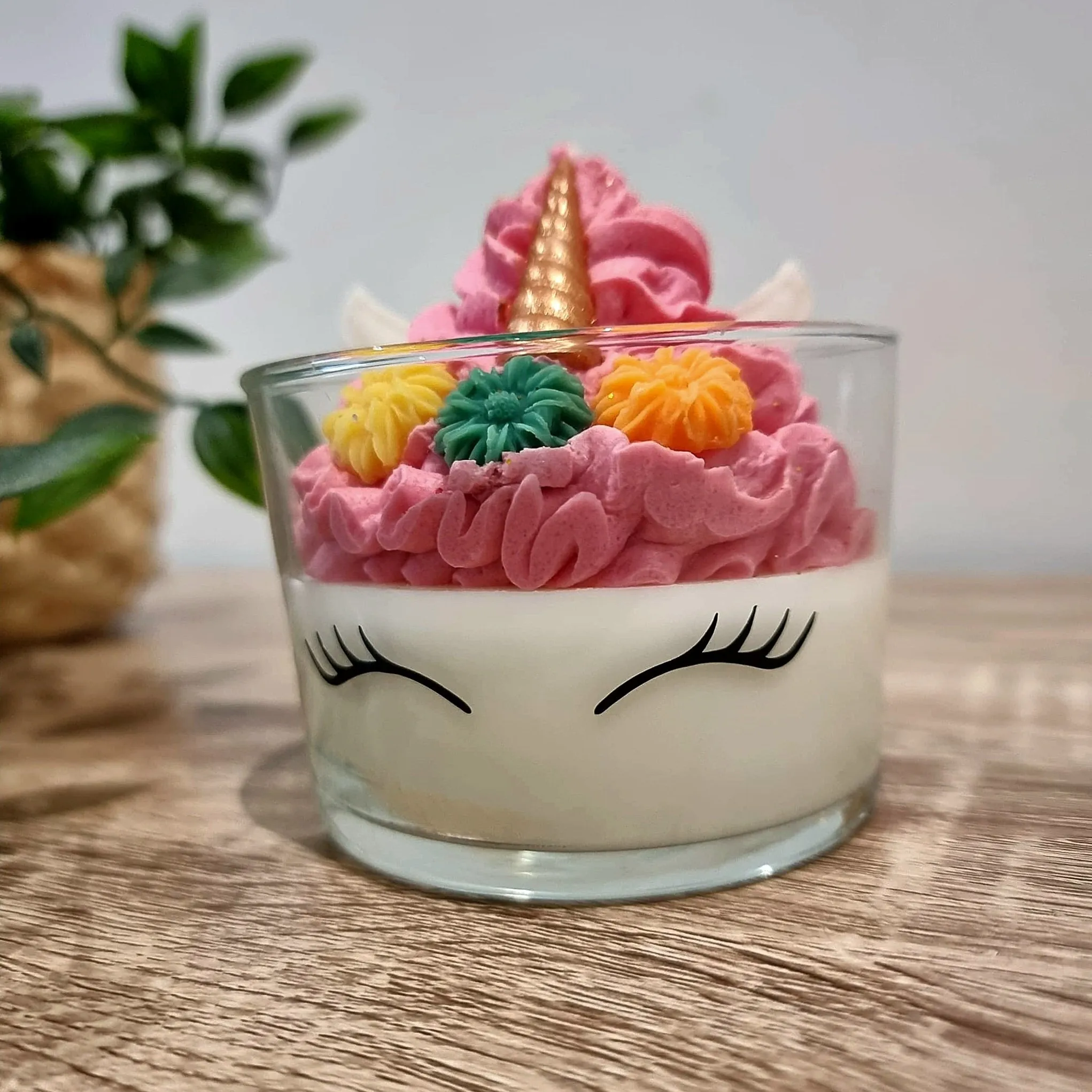 Ésta vela con forma de unicornio y con aroma a algodón de azúcar, emana una fragancia dulce y entrañable.
