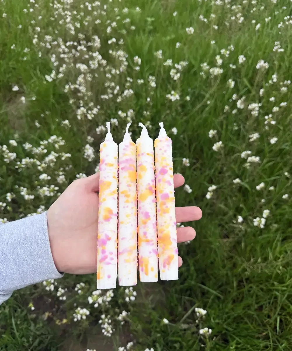 Pack de tres Velas Decorativas Confeti 🌈 hechas y coloreadas a mano con cera de esterina natural y cera de soja 🌱.