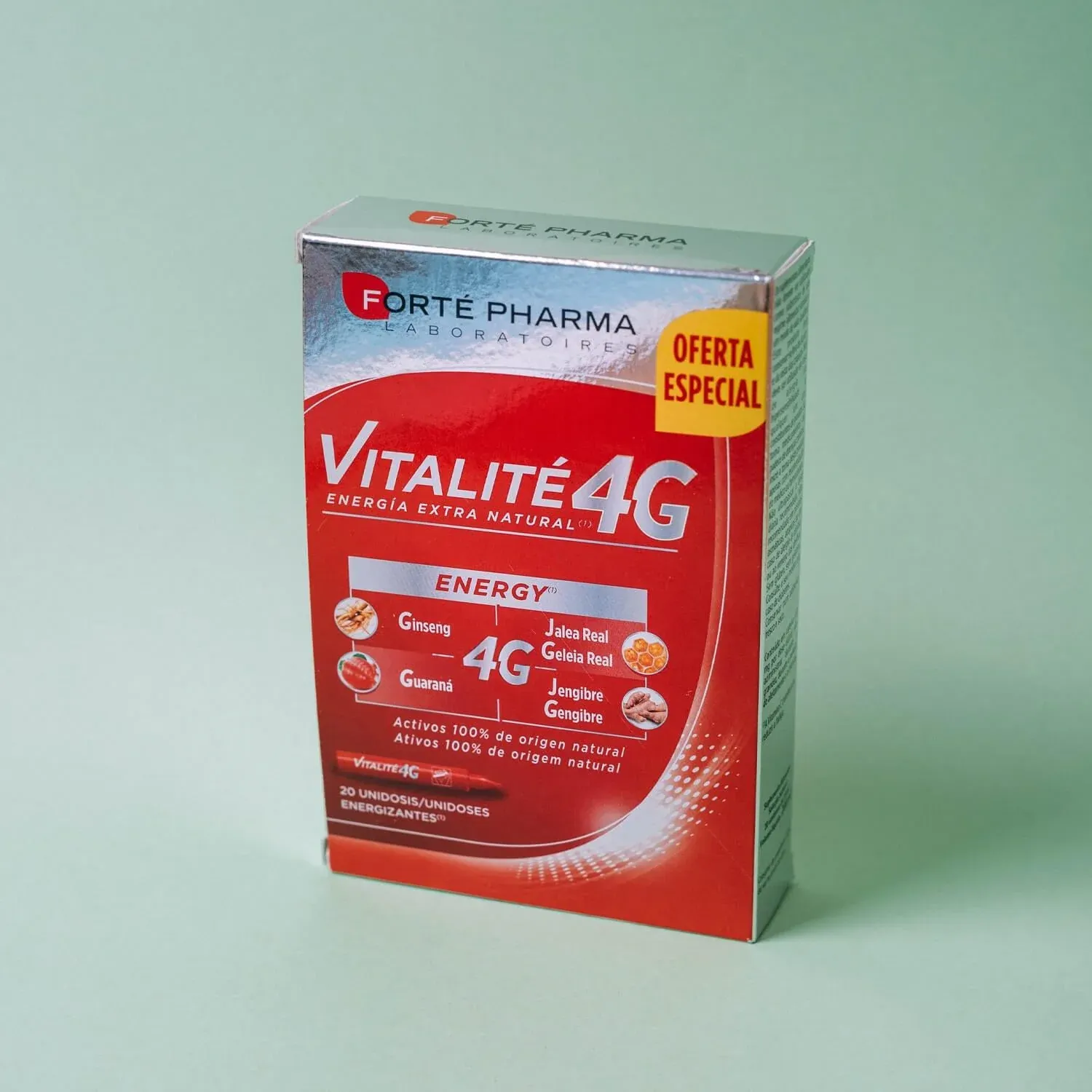 Vitalité 4G Energy Unidosis es un complemento alimenticio a base del complejo 4G: ginseng, guaraná, jengibre y jalea real.