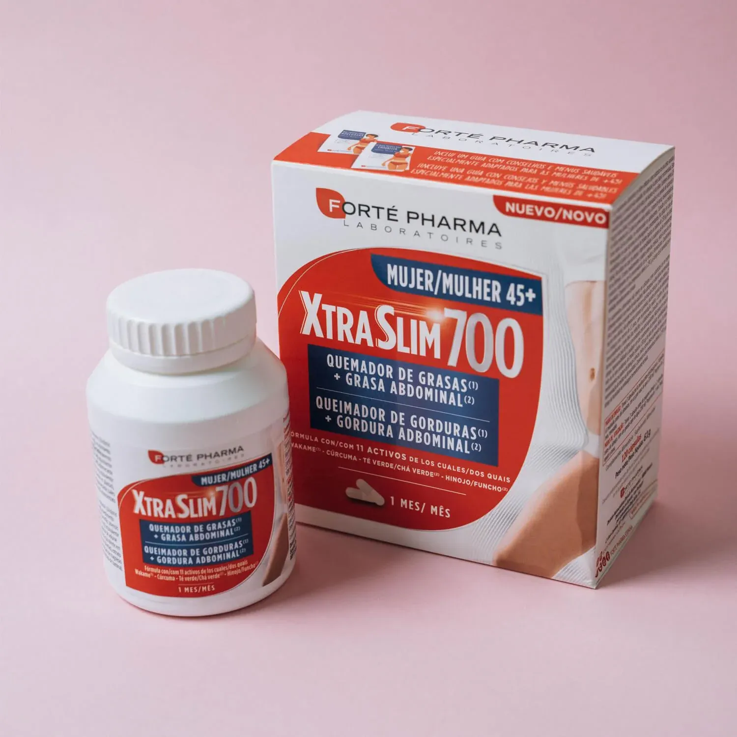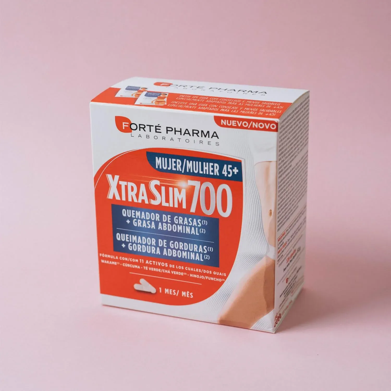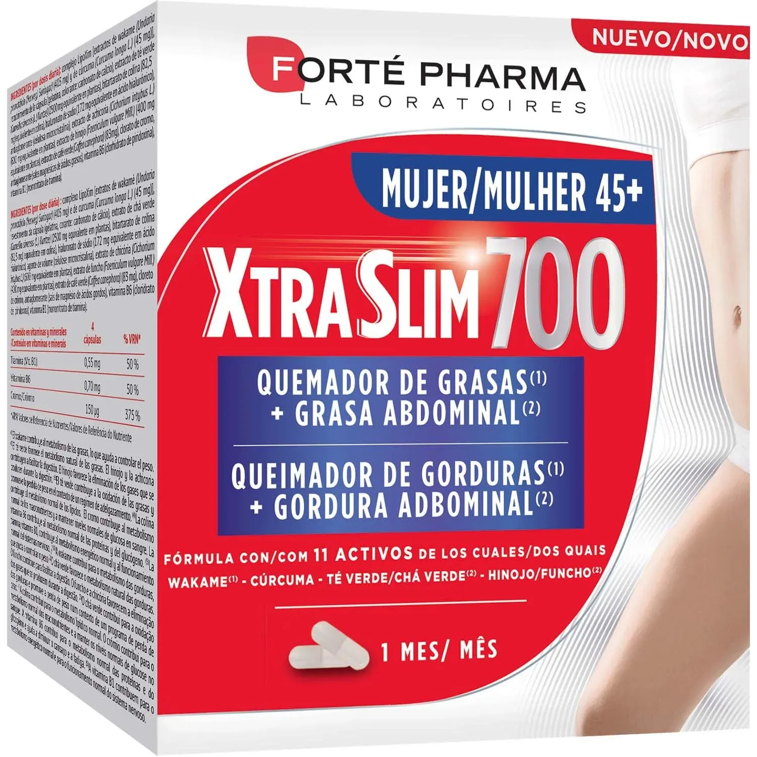 XtraSlim 700 45+ es un complemento alimenticio pensado para las mujeres de más de 45 años. Elaborado a base de una asociación de wakame y cúrcuma, té verde e hinojo. La colina, el cromo y las vitaminas B6 y B1 completan la fórmula.
