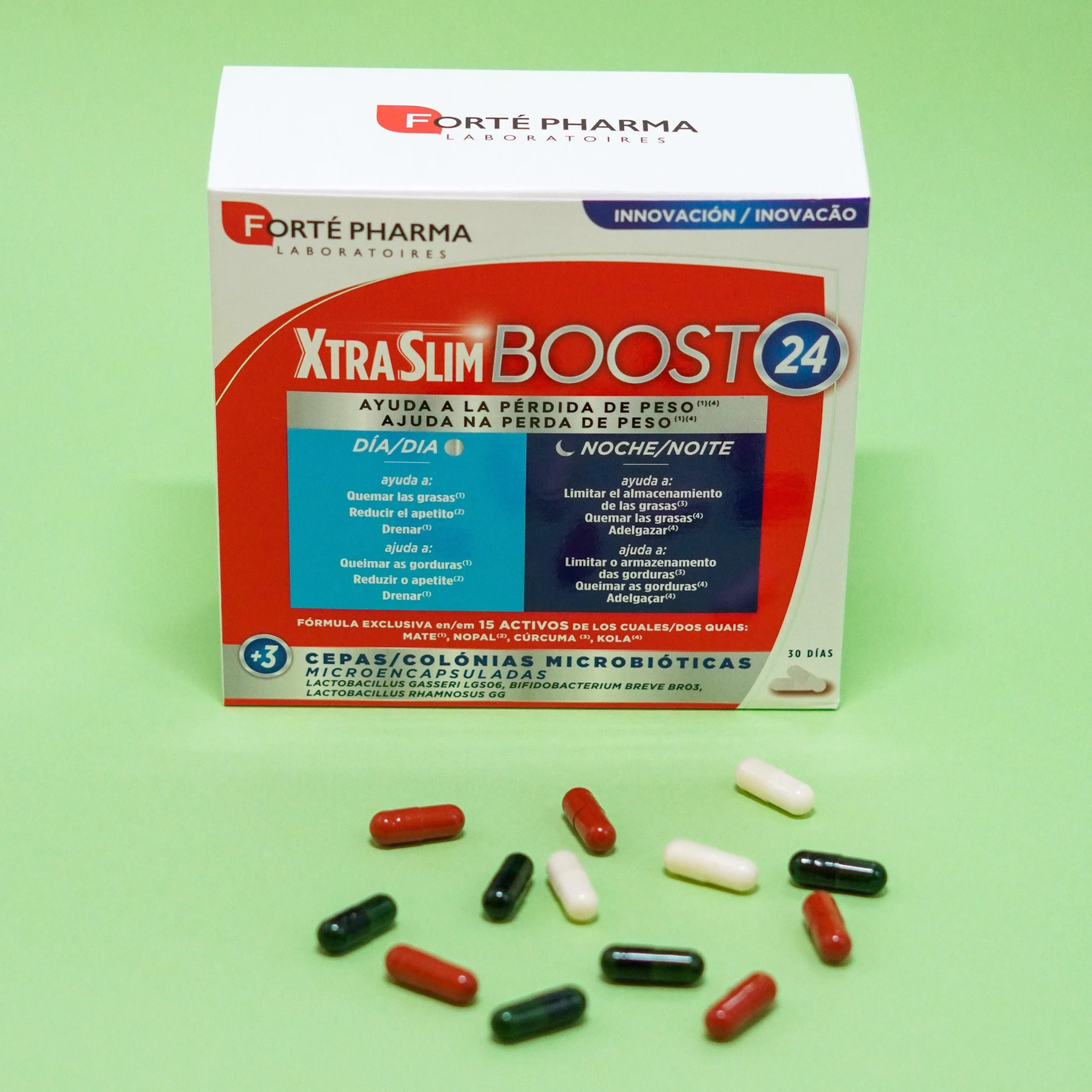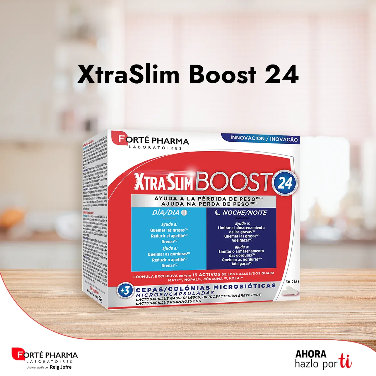 XTRASLIM BOOST 24 es un complemento alimenticio con mate, nopal, cúrcuma y cola junto con 3 cepas microbioticas. Los activos actuan en el momento más adecuado del día y la noche para obtener un resultado óptimo.