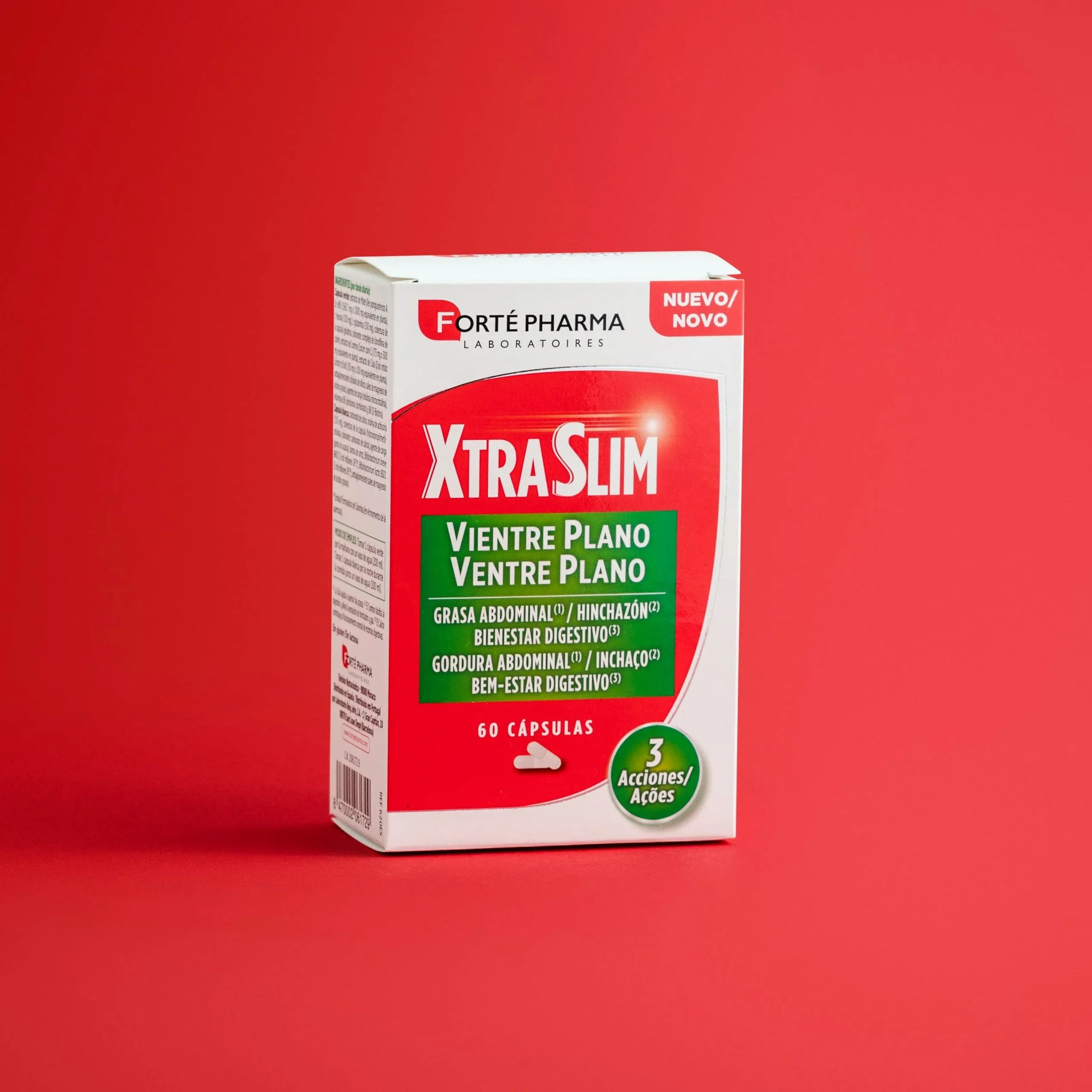 XtraSlim Vientre Plano es un complemento alimenticio elaborado a base mate, cola y comino. Además, aporta dos cepas microbióticas e inulina de achicora que refuerzan la fórmula.