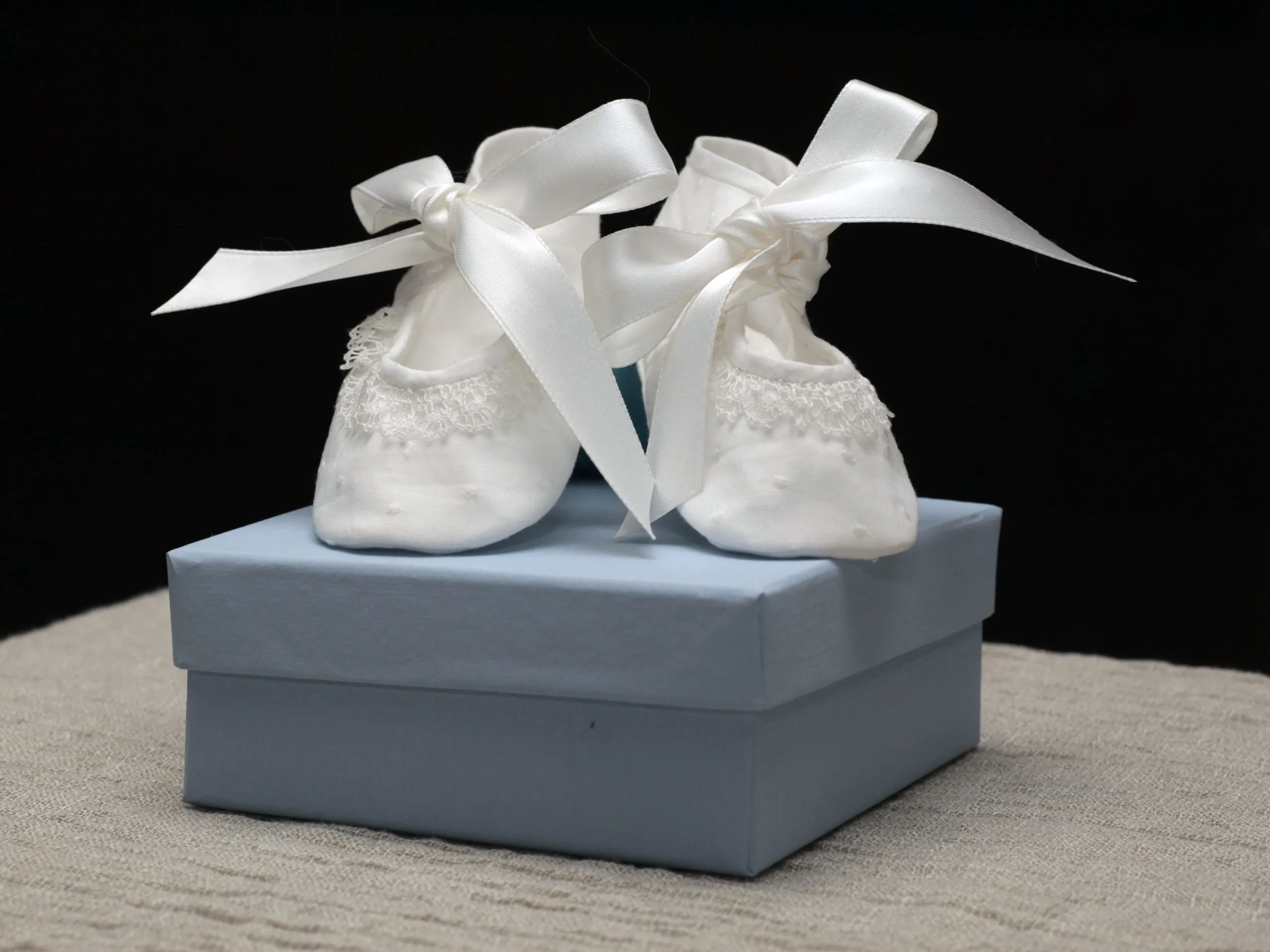 Preciosos zapatos de bebé elaborados en plumeti de algodón con encaje de bolillos y lazo de satén.