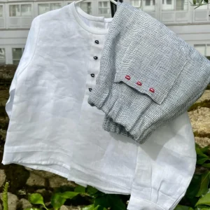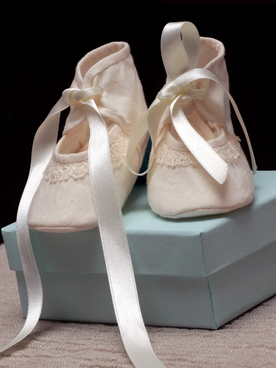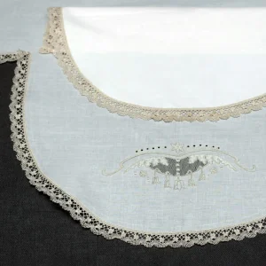 Zapatitos de lino natural con encaje de bolillos color blanco y lazo de satén a juego.