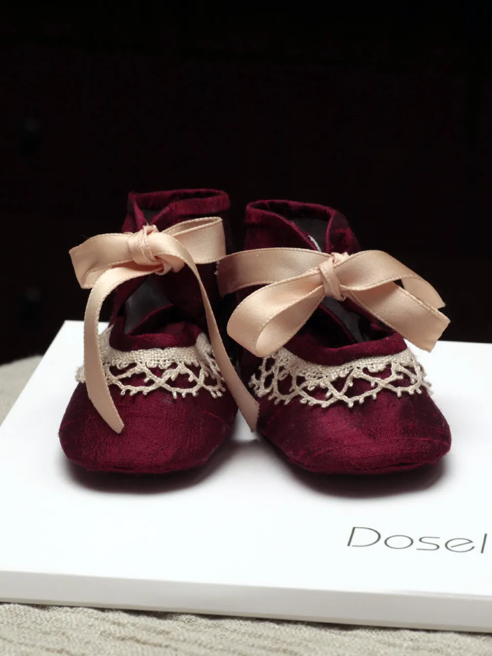 Elaborados de modo artesanal en seda salvaje con encaje de bolillos y lazo de acetato.