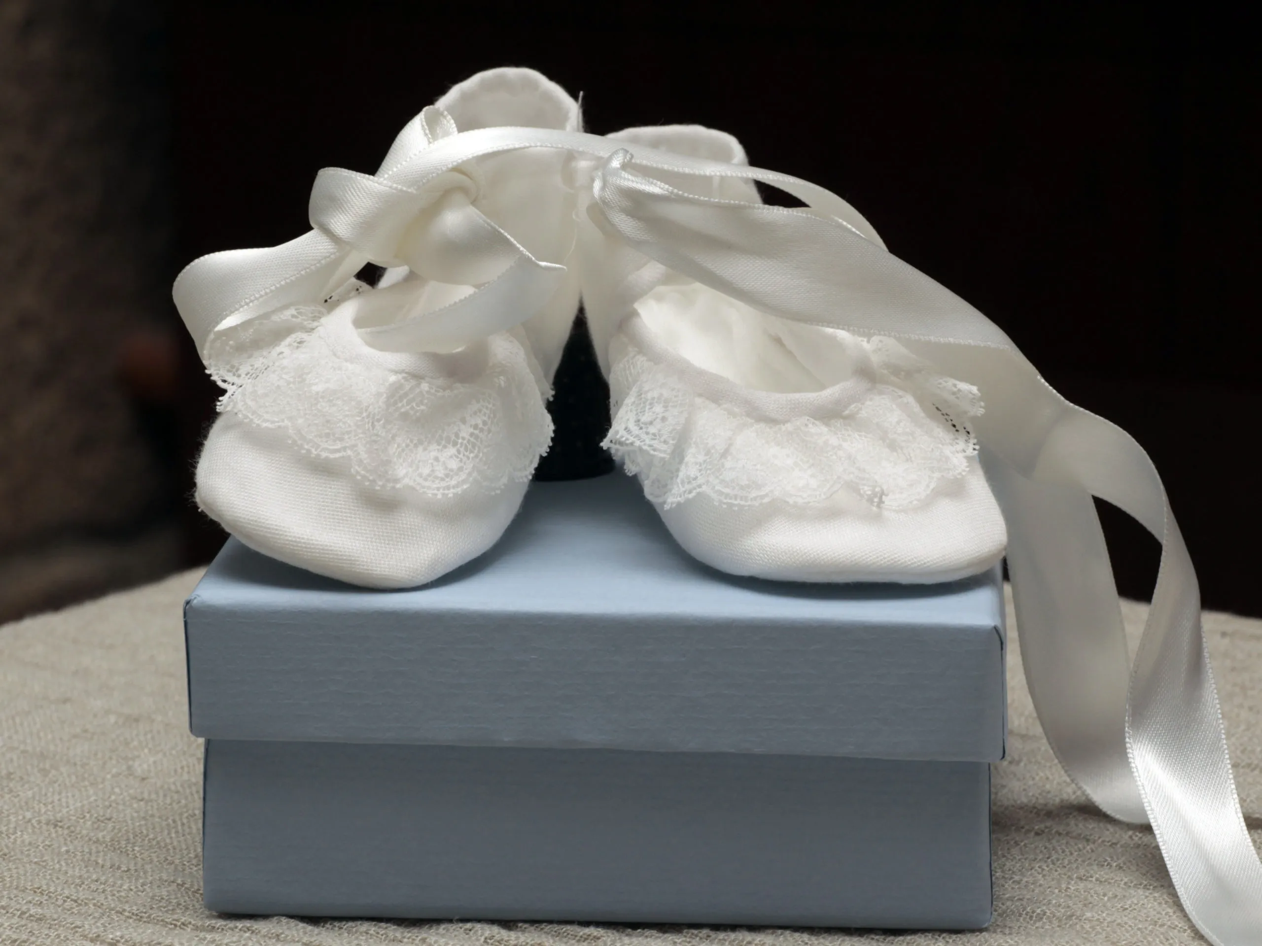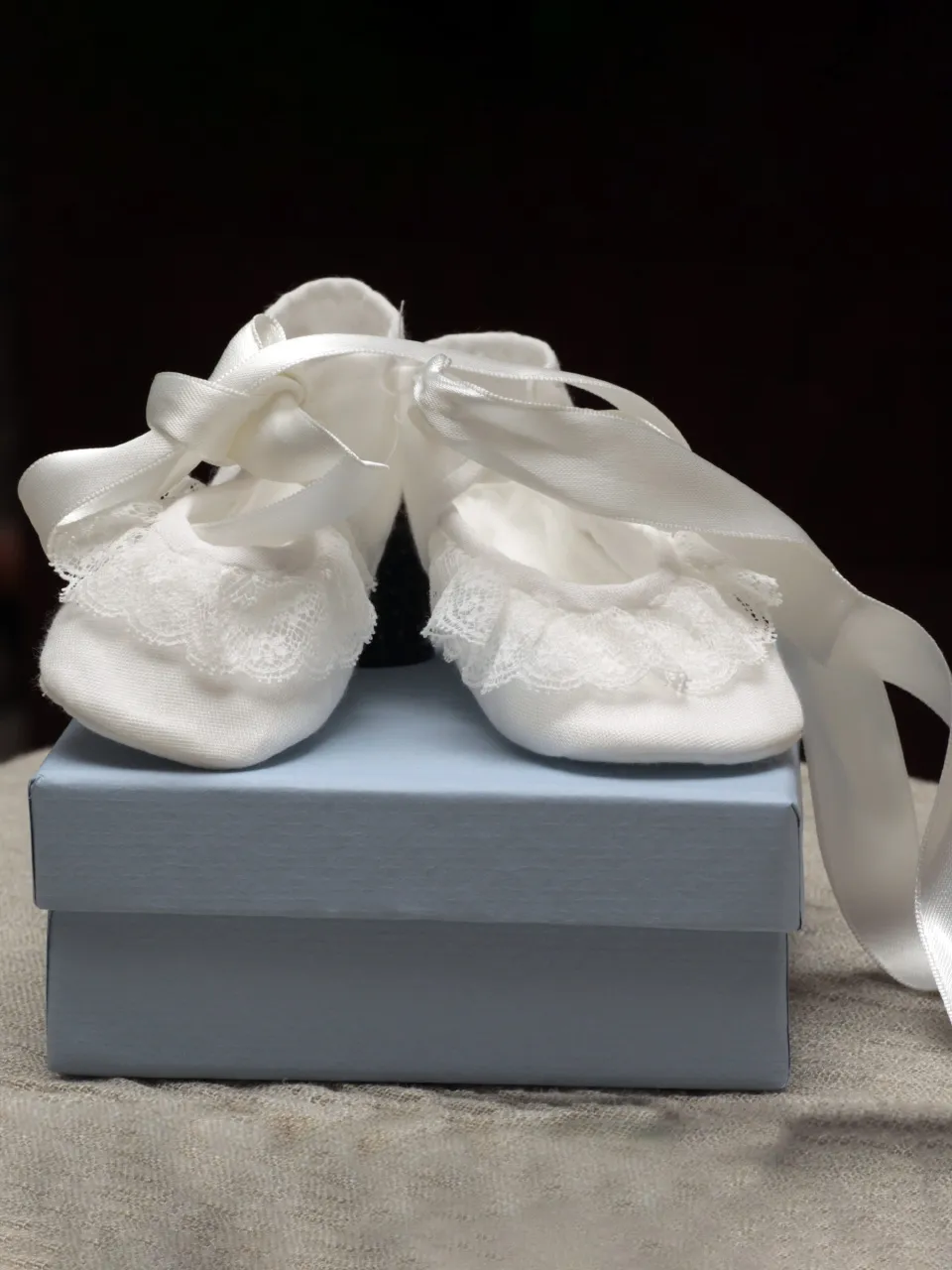 Estos delicados zapatitos de bebé están elaborados con dos batistas de algodón, valencienne y lazo de satén.
